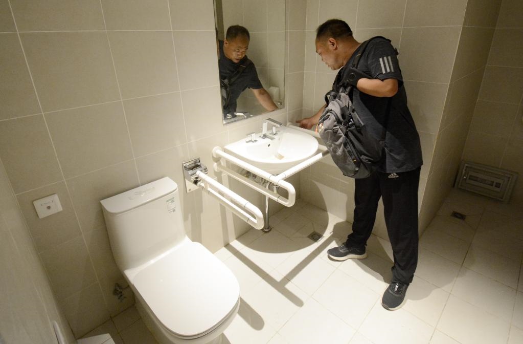 2021年7月15日,無(wú)障礙專家在北京延慶賽區(qū)冬奧村檢查室內(nèi)衛(wèi)生間無(wú)障礙設(shè)施。新華社記者 李欣 攝